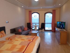 Doppelzimmer (2 Personen), gemütliche Wohnecke, Sat-TV, Dusche/ WC, großes Granitwaschbecken, Kosmetikspiegel, Fön, Wasserkocher, Tassen, Besteck und Gläser vorhanden, Balkon Südseite.